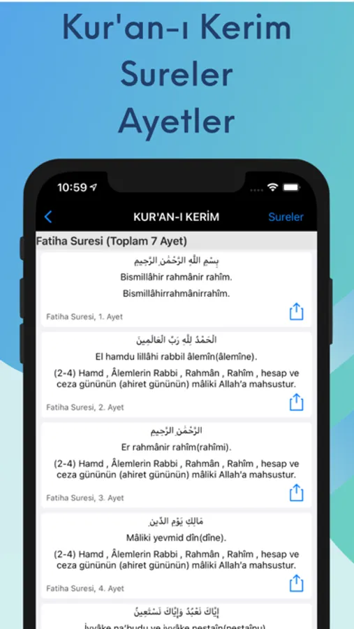 Kuran ayetlerini ve meallerini uygulama içerisinde bulabilirsiniz. Kur'an surelerini hızlıca aratabilirsiniz.