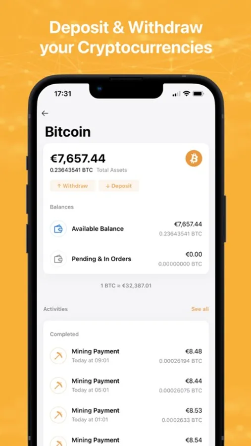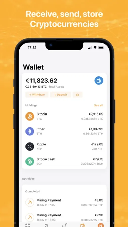 Deposit or withdraw over 60 cryptocurrencies and check your wallet activities. Please note that this is not a mobile cryptocurrency wallet, no seed phrases are stored on your device. NiceHash provides a secure custodial wallet for all users.