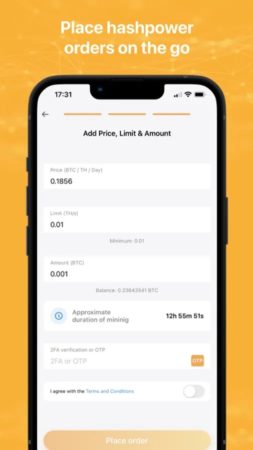 Check the status of your hashpower orders, place new orders, and manage or cancel existing orders easily on the go.