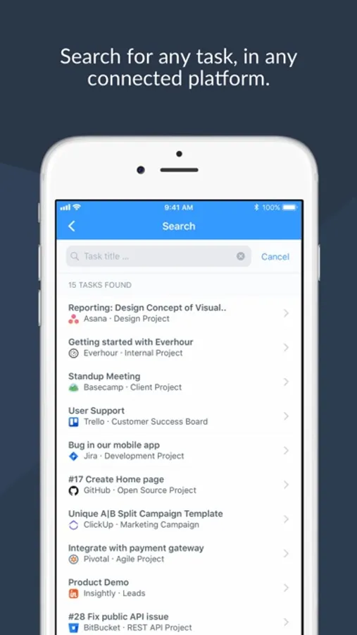 Use our app to easily start a timer or log time for any date, search for your Asana, Basecamp, Trello, Jira, GitHub tasks here and track your time in a single place.