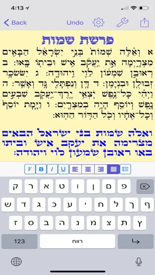 Hebrew Writer has a built-in Hebrew text library including Tanakh, Talmud, and Mishnah. Easily add text from these libraries to your document with just a tap.