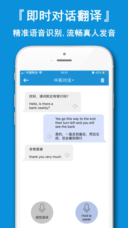 [real time dialogue translation] hold down to speak, real-time translation, speed and accuracy, face-to-face and barrier free communication with foreigners.