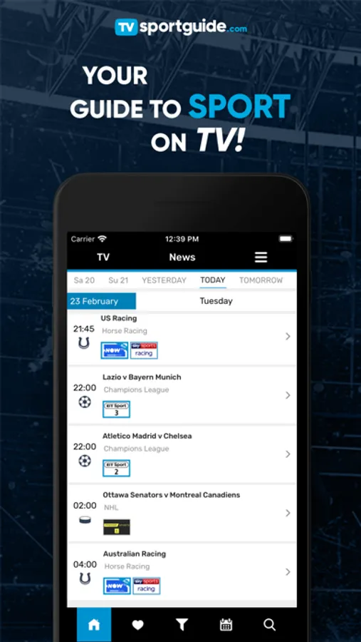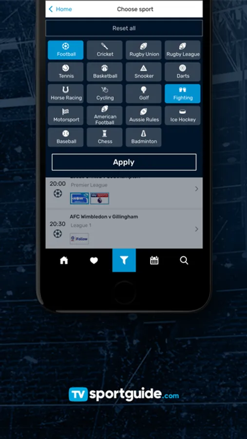 - Filter the listings by selecting channels and sports.