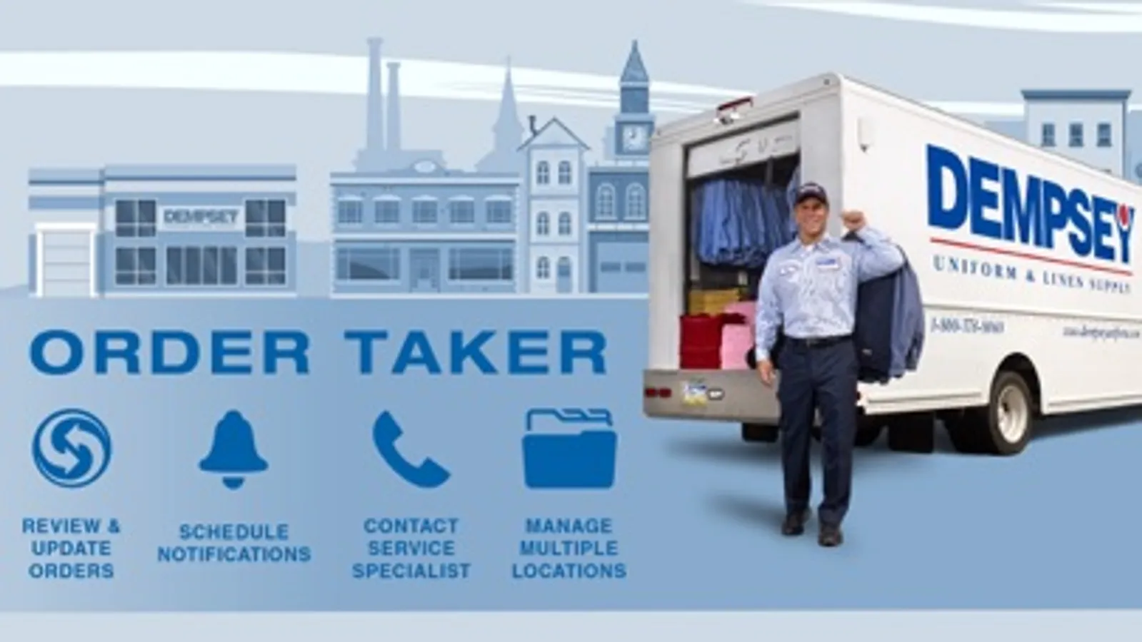 Customers can place linen orders with Dempsey Uniform & Linen Supply’s Order Taker App. Place your complete order or adjust what’s already scheduled for delivery. When you are working late, the app works too. You don’t have to wait for Dempsey’s business hours to place your linen orders. It’s 24 hour convenience.