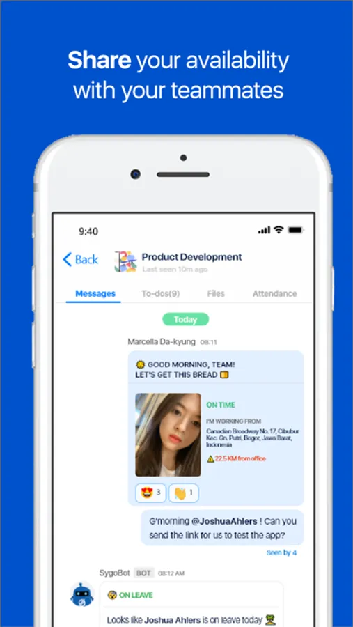 Simulate the environment of a single office, wherever you are. Send an automatic message to your team to inform them you are ready for work