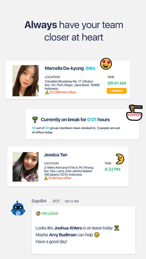 Need to quickly look for someone from hundreds of other employees? Simple mention them with @ and let Sygobot find them, or if they’re on leave, someone in their division that can assist you