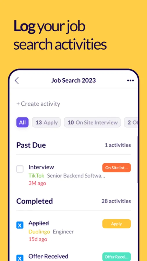 Track everything you need to know about your job opportunities. Add tasks, notes and important events like interviews, deadlines and offers. Save the posting URL, job title, salary, location, company and more.