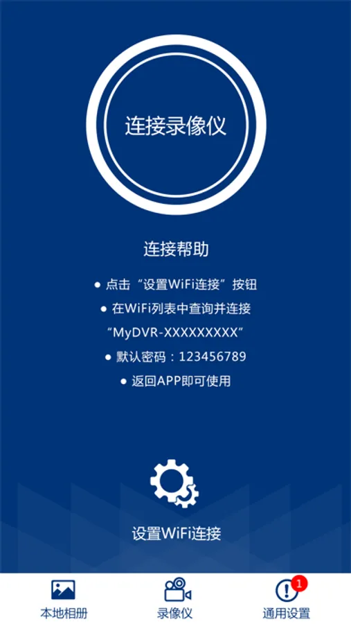 行车录像18Y 应用是和WiFi版的行车录像仪配合使用,手机通过Wi-Fi连接WiFi版行车录像仪,使用该APP实现对录像仪的在线管理,包括图像实时预览/拍照/回放/下载/删除/设置等功能。