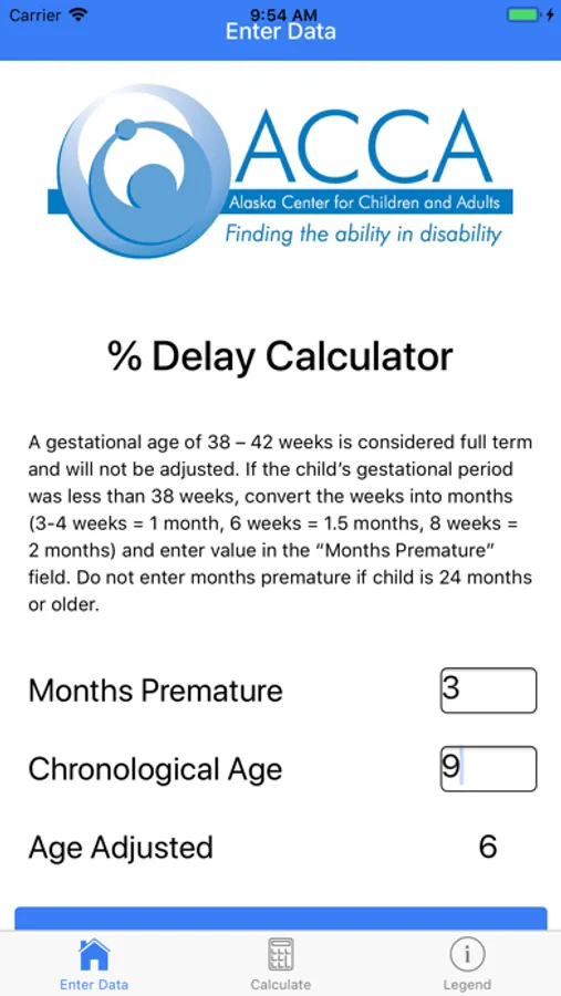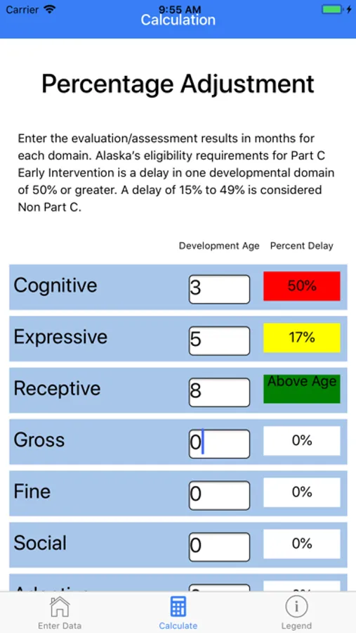 This app was developed for providers to calculate percentage delay. It is color-coded based on Alaska's eligibility requirements but any state may utilize the calculator to determine the percentage delay.