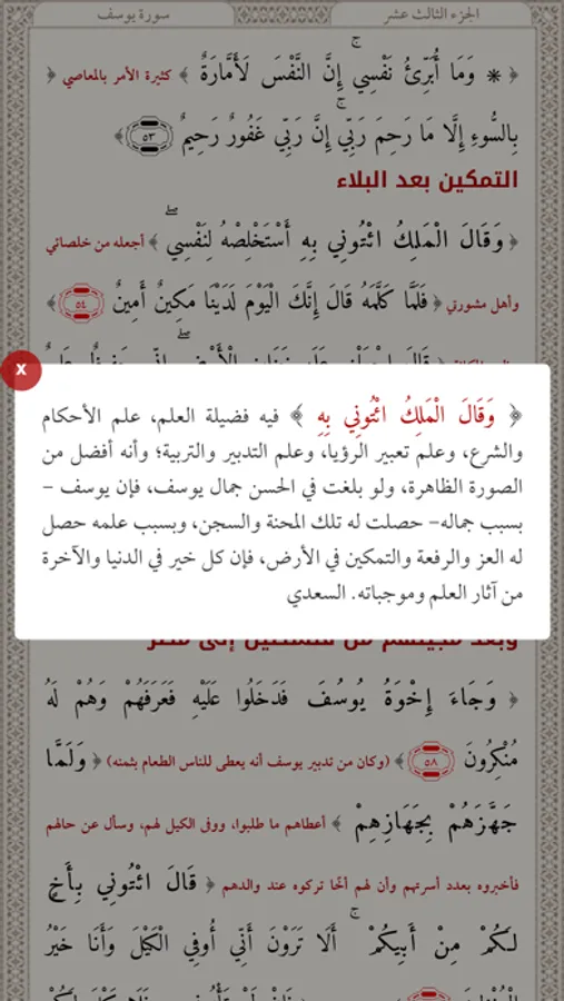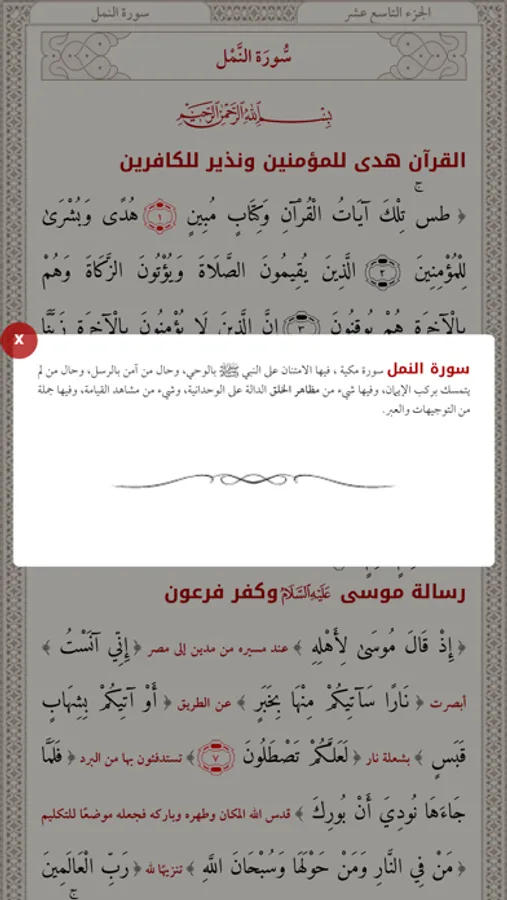 2/إذا تم الضغط على نهاية الآية الملونة بالأحمر سيخرج لك أسباب النزول والفوائد المتعلقة بالآية, أما الآية الملونة في الاسود فلا يخرج شيء.