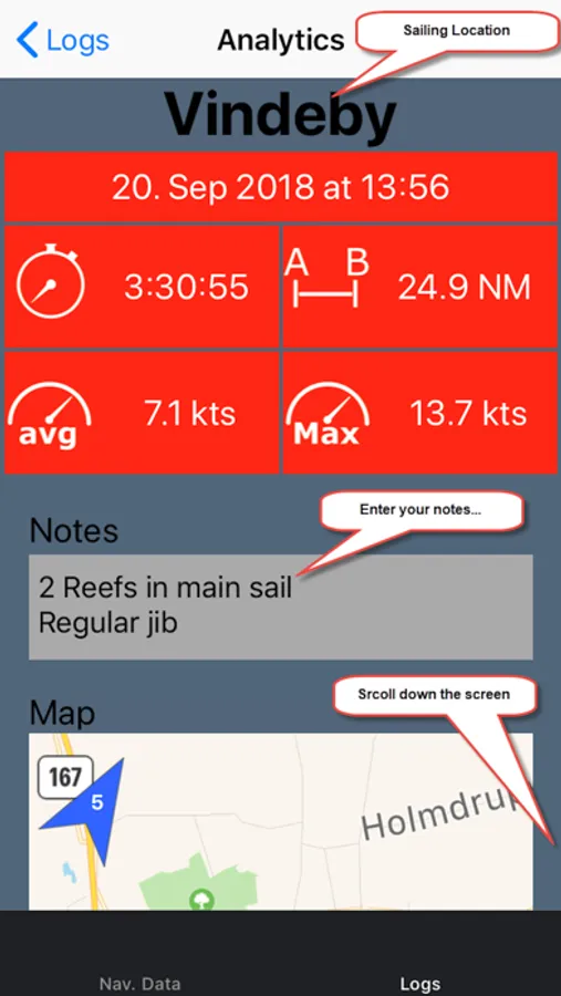 You can record your track and analyse your maneuvers like tacks and gybes. Send gpx files as email to friends, or show your track on a map.