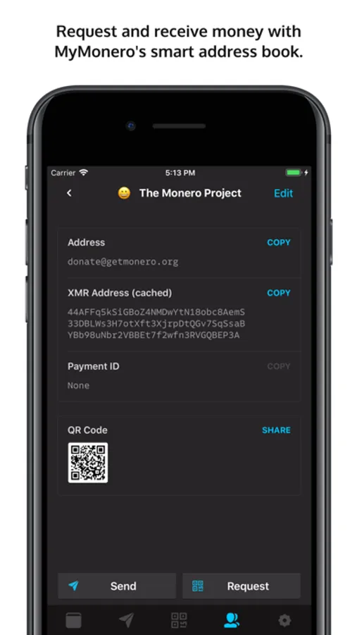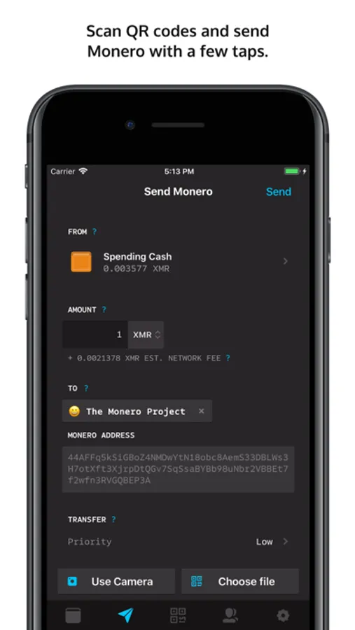 MyMonero is feature-packed, and designed to support zippy in-person transactions. Need to send your buddy some Monero? Have them create a new Request QR code. Simply scan it with your phone and hit Send!