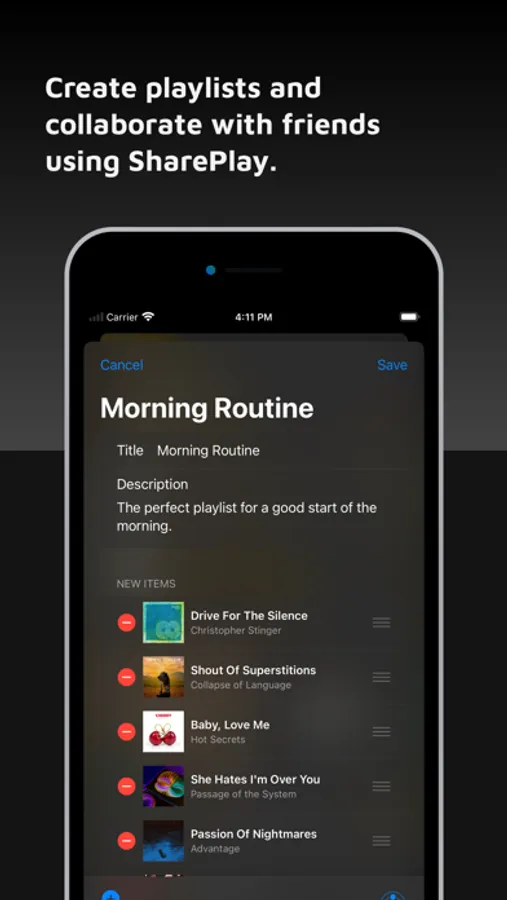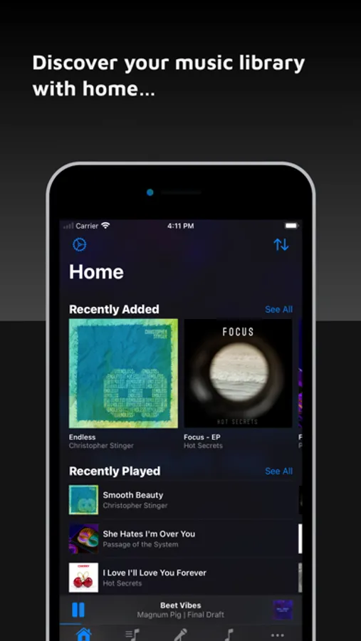 Add scrolling lyrics in the LRC format to any song in your music library and Handoff the currently playing song. The player supports 3 visualizer styles that react to device tilting.