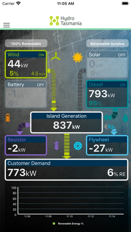 See in real time how communities can operate at 100% renewable energy with interactive live data and educational information on how to successfully integrate renewable energy. View the contribution of solar and wind power combined with advanced control systems and enabling technologies such as battery energy storage, flywheels and dynamic resistor, work together to contribute to the power needs of an island community, while reducing the reliance on diesel fuel.