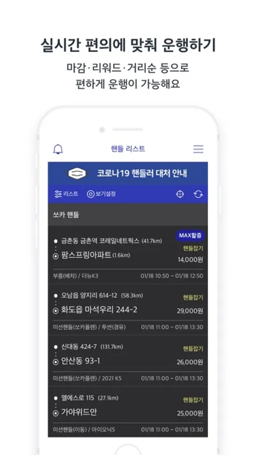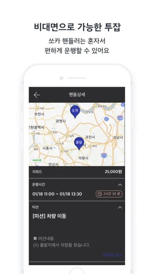 핸들러 서비스는 기본적으로 비대면 서비스로 부담없는 운행이 가능합니다. (일부 핸들 제외) 단, 정해진 시간과 규칙에 맞게 운전해주시는 것 알고 계시죠~?
