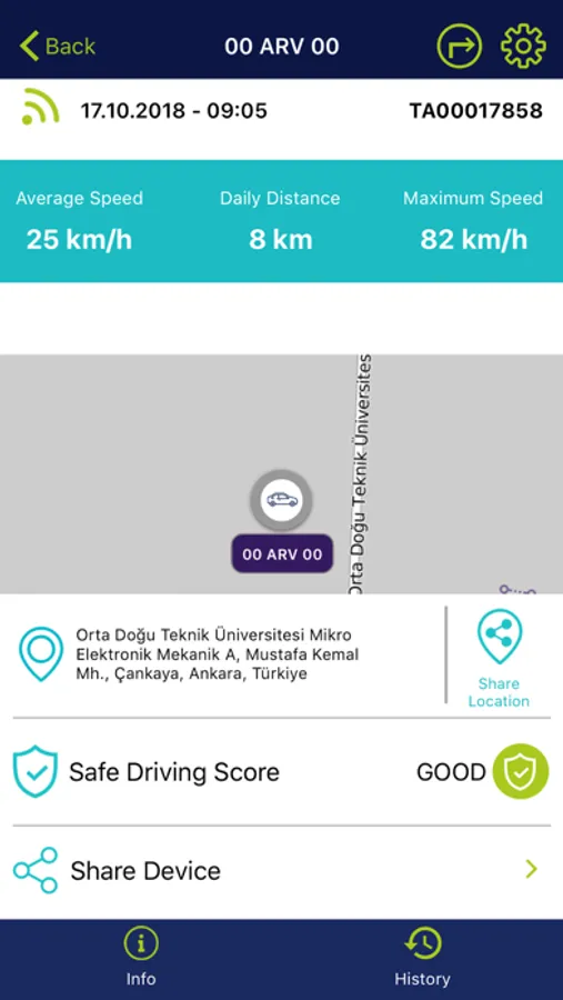 Thanks to the Treyki Auto device, which is easily installed to the OBD socket of your vehicle and the Treyki application, which is operable with the device, you can track either daily or historical data on travel distance and travel time. You can obtain data on sudden acceleration and deceleration and speeding and modify your driving habits and the driving habits of your loved ones in a positive way, by using the “Road Safety” score, which you may set with this data.