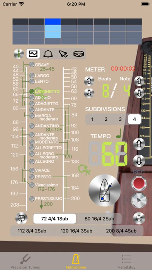 - Intuitive beat mode selection, 18 types, including: Grave 25-45 / Largo 40-60 / Lento 45-60 / Larghetto 60-66 / Adagio 66-76 / Adagietto 72-76 / Andante 76-108 / Andantino 80- 108 / Marcia moderato 83-85 /Andante moderato 92-112 / Moderato 108-120 / Allegretto 112-120 / 116-120/ Allegro 120-156 / Vivace 156-176 / Vivacissimo 172-176 / Presto 168-200 / Prestissimo 200 Bpm and over