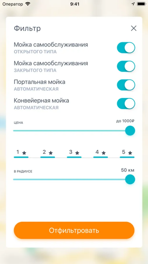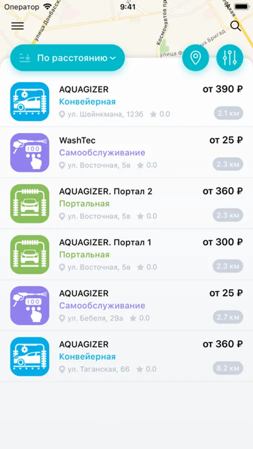 * Автоматические мойки и мойки самообслуживания на карте с возможностью фильтрации по типу, рейтингу, расстоянию и стоимости.