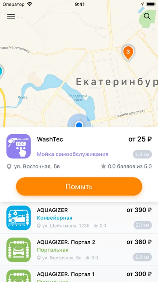 - Откройте приложение и выберите мойку на которой находитесь или которую планируете посетить.
