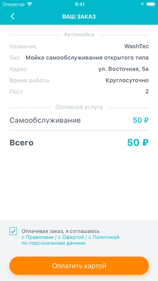 - Оплачивать услуги автомойки через приложение, используя банковскую карту.