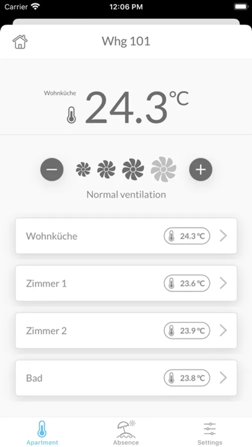 The system regulates the living room temperature allowing different ventilation levels to be set for your home. The App shows the current temperature in the living room. The temperatures of the other living spaces can be adjusted relatively to the living room. The system's variable ventilation can take place manually or automatically.
