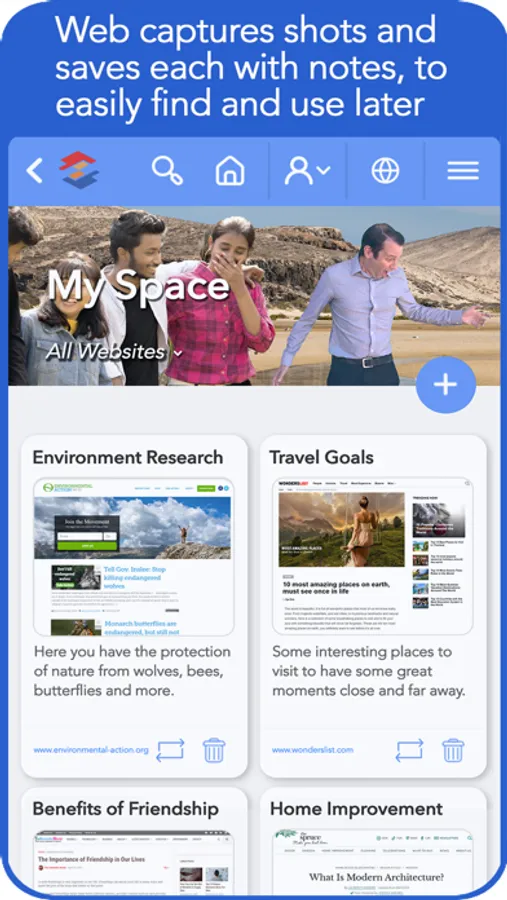 · Organize the content found in the Web world with much more than a cryptic bookmark, so that it will never be hard to find again. That is also made possible by visually seeing a small screenshot of the website together with your own descriptions. Even better, it works with any browser.
