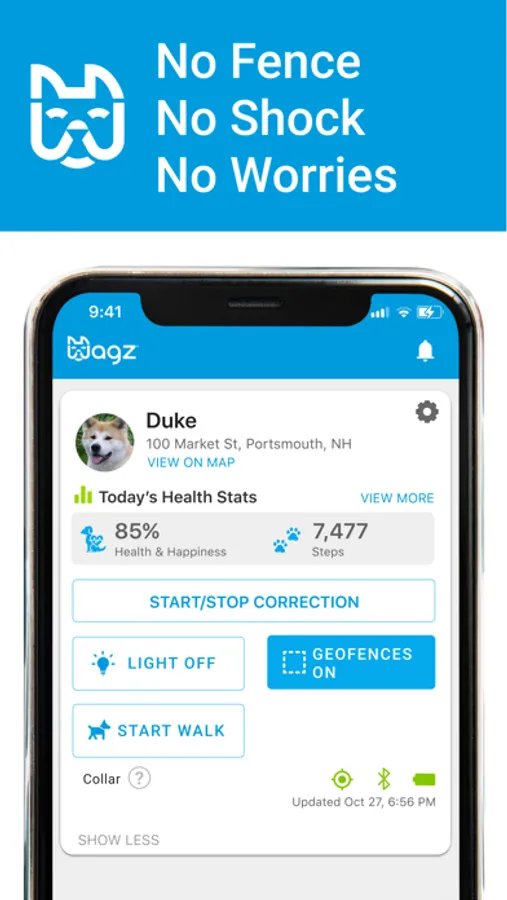 Set your dog free without sacrificing peace of mind with the Wagz Freedom Smart Dog Collar. Our customizable geofence technology with shock-free corrections, real-time GPS location tracking, daily activity and health insights, and much more, lets your dog run safely while you stay connected to his wellness and whereabouts. Powered by our patented Kognition™ platform, Wagz provides a total, connected pet lifestyle - designed to give your dog a voice, strengthen your bond and ensure his safety, health and happiness. You know exactly how your dog is doing, where he is, and what he needs. You can even ask Alexa questions about your dog and Wagz will answer. The Freedom Collar pairs with the Wagz App using a cellular network, Wi-Fi and Bluetooth, offering your dog freedom to roam while you enjoy the feeling of security.