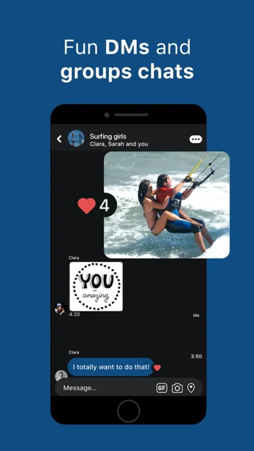 • Events have a group chat, a date, location, photos and more