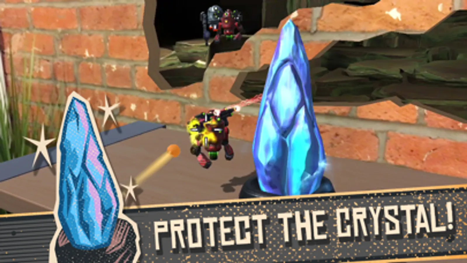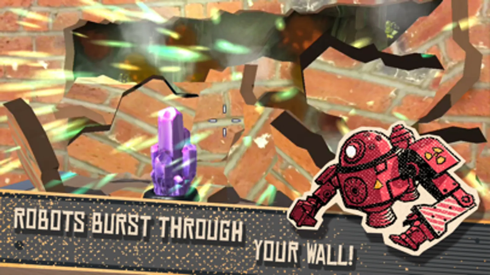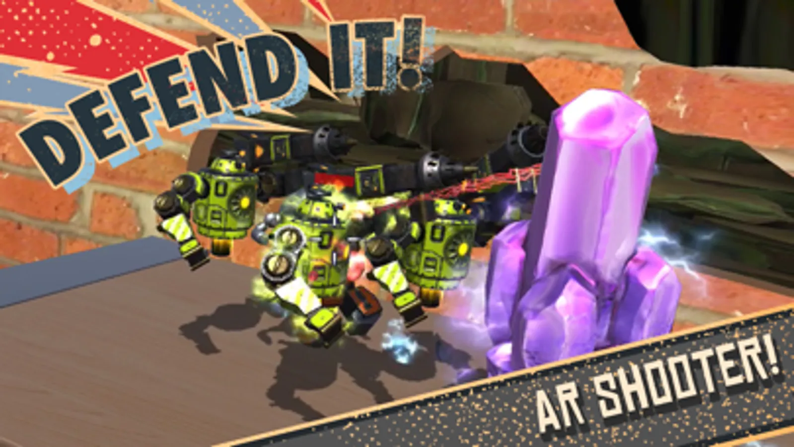 Experience the magic of intense augmented reality action as robots come BLASTING through your living room walls! Peer through the gaping blast holes and shoot into the the alien world! Destroy them before they come pouring through and overwhelm you! Defend your crystal at all costs!