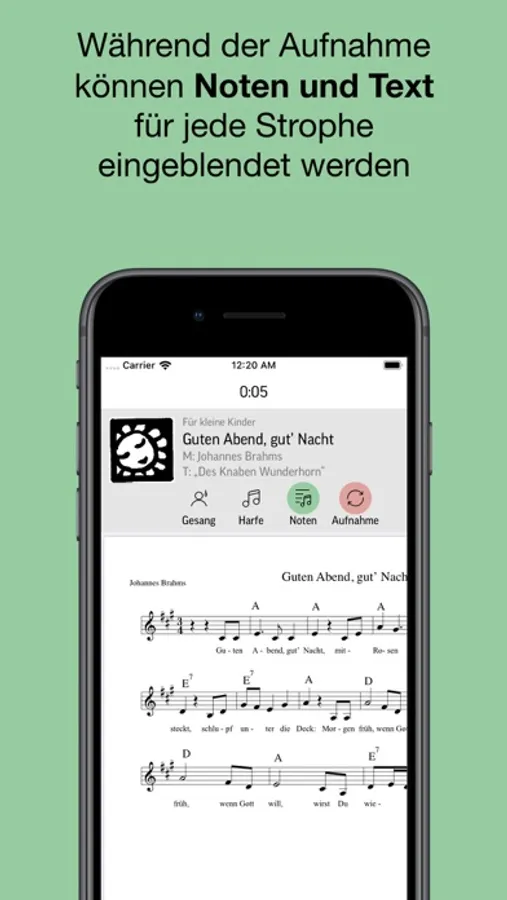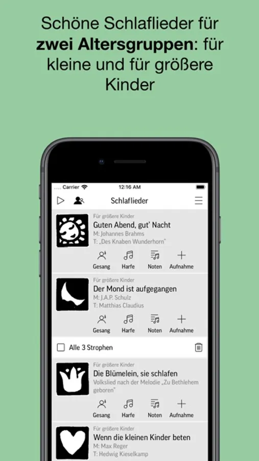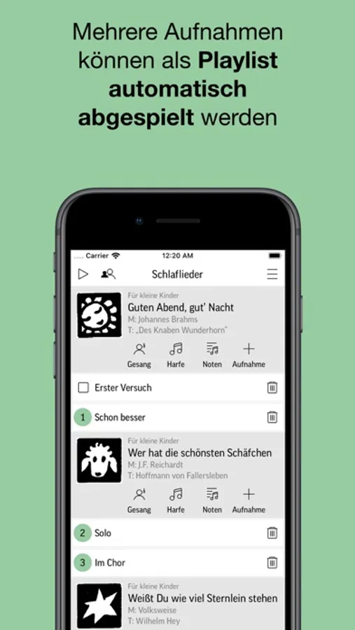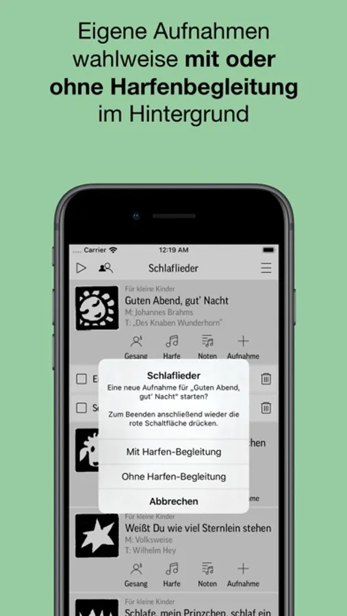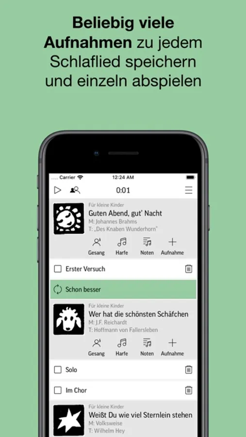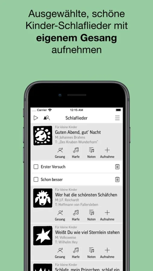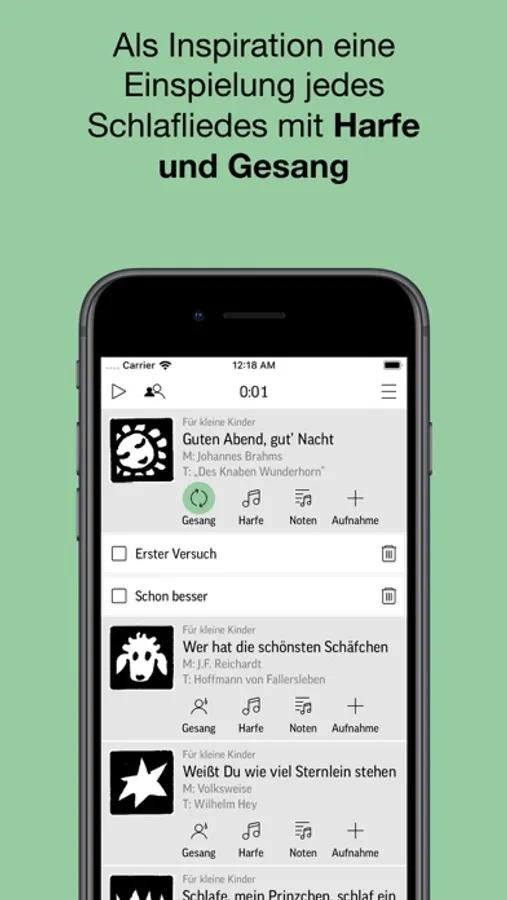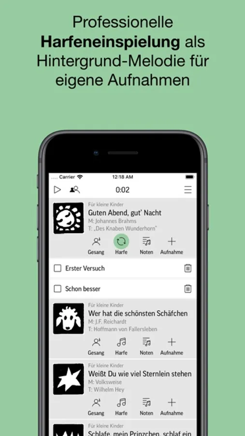 Sollten Sie ausnahmsweise abends einmal nicht am Bett Ihres Kindes sein können, ist Ihnen so die Möglichkeit gegeben, ihren eigenen Gesang zur Harfe aufzunehmen. Viel schöner ist es natürlich für Ihr Kind, wenn Sie persönlich bei ihm sind und singen.