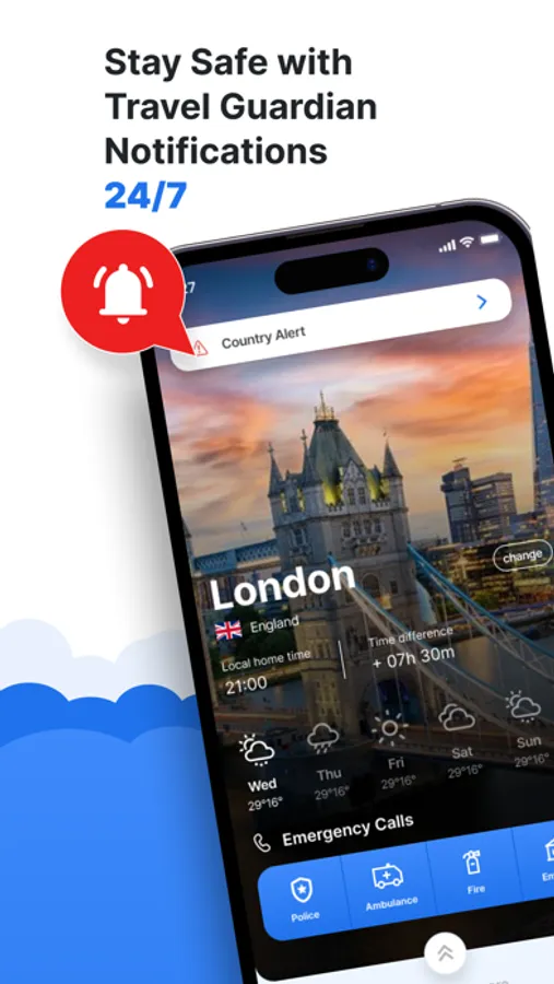 - Government travel warning notifications (including natural disasters and terror alerts)*- Travel Guardian 24/7 safety notification