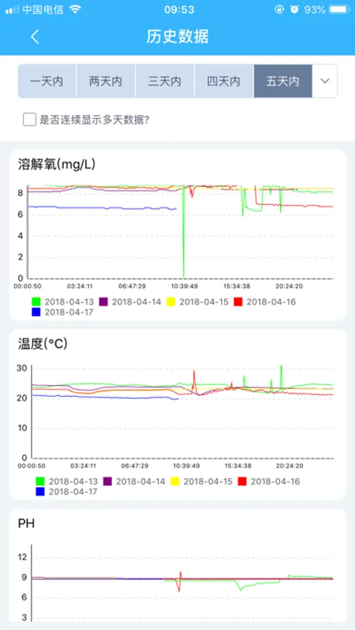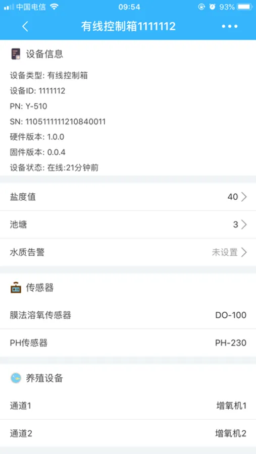 4.点击有设备的池塘进入到池塘设备详情界面, 可以看到设备的状态,也可以查看该设备检测的水质的历史数据,和去控制设备, 已经查看池塘的创建信息;