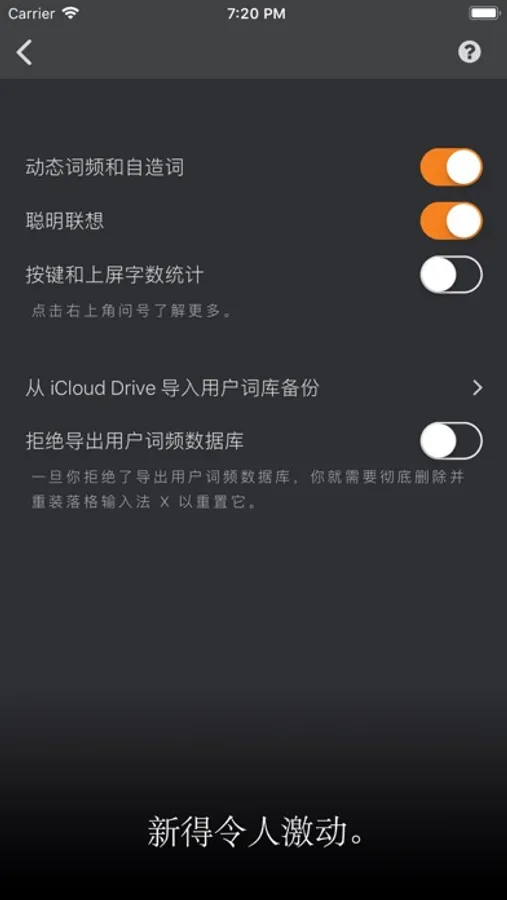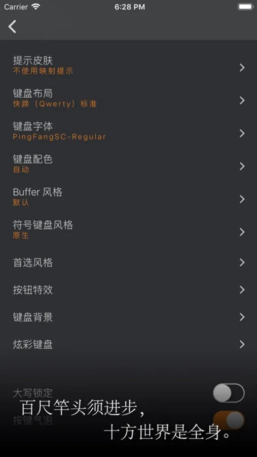 我们知道喜欢新鲜的你根本停不下心里成为与众不同的渴望,落格输入法 X 允许你自定义按键上的字体,你的 iPhone 内置了多少种字体,我们就支持多少种字体!我们还为你准备了键盘背景颜色选择器,你甚至可以手动输入一个精确的 css 颜色值!