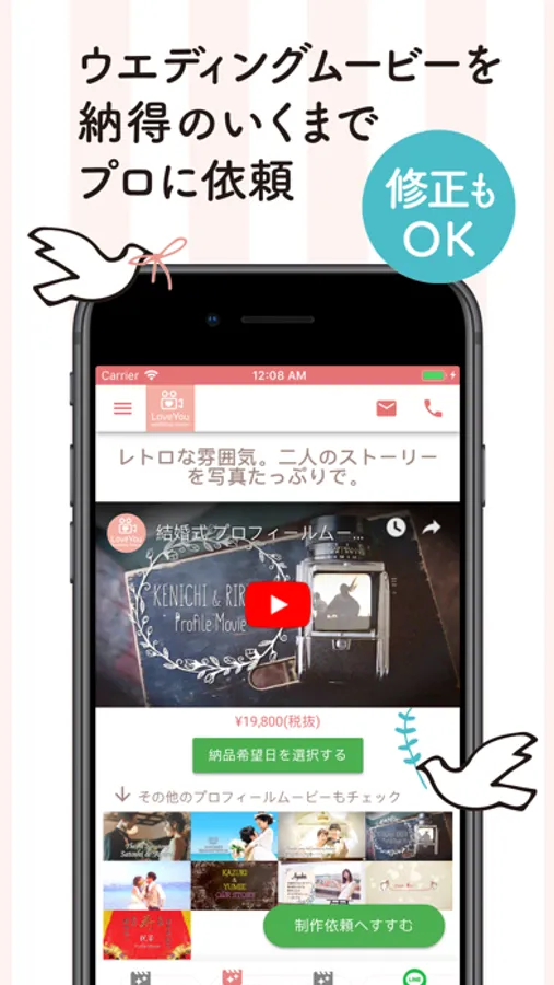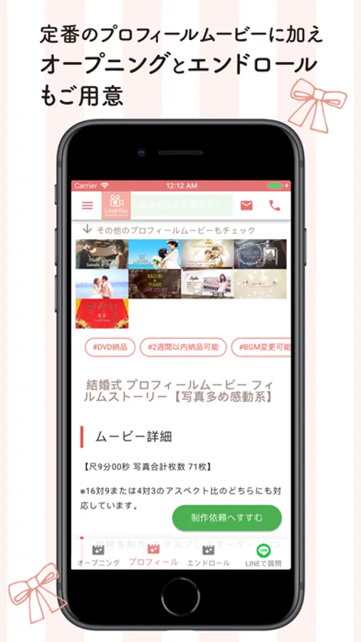 オシャレな結婚式ムービー(オープニングムービー、プロフィールムービー、エンドロール)の作成をお手頃価格でプロに依頼できるアプリです。