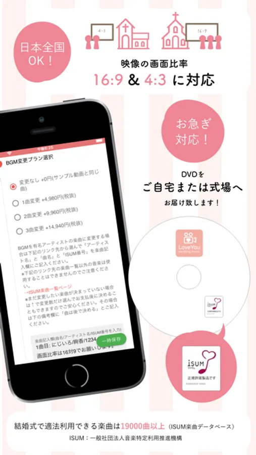 ご注文ページで、お好きな楽曲をお選びくださいませ。納品時にはDVD盤にISUMの証明シールを貼り付けて納品しますので式場で著作権問題で上映を断られる事はありませんのでご安心くださいませ。
