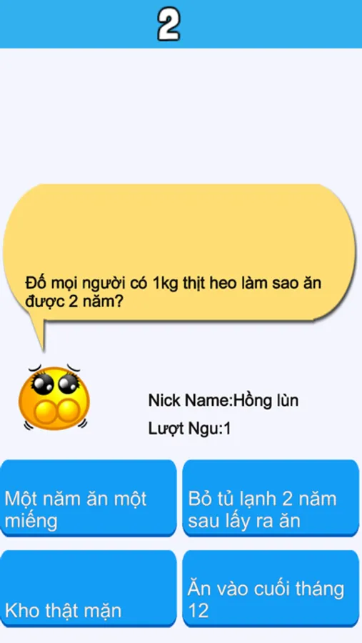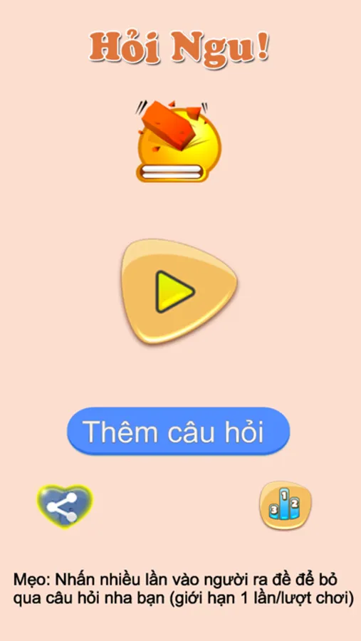 Trò chơi Hỏi Ngu hại lão đòi hỏi bạn cần có 1 tâm hồn trong sáng và trái tim của bọn trẻ trâu. Với cách chơi đơn giản lôi cuốn. Cùng với những câu hỏi bổ ích mang tính văn hóa trẻ trâu đầy ẩn ý trong sáng và ngây thơ vô số tội. Theo đó là nhưng icon hài, bựa, troll đầy hiểm hóc khó cưỡng lại. Thách thức sự trong sáng của người chơi. Hỏi Ngu xoáy đáp xoay vui nhộn mắc cười xả tress thì thôi rồi lượm ơi. Rất phù hợp với những cá nhân thất tình hoặc FA vào game này mà học hỏi có thể lấy câu hỏi trong game này đi hỏi người khác và họ sẽ điên đầu lên mà không tìm được câu trả lời và chắc chắn họ sẽ đặt cho bạn 1 biệt hiệu là THÁNH HỎI NGU. Vui lắm! Chơi thôi đối lúc khó hiểu một chút nhưng sẽ hiểu ngay thôi !. Troll đủ kiểu. Người ra đề và người chơi đều bị chửi là ngu hay óc ckó nhưng đều cảm thấy vui và thỏa mãi. Vì nó là trò chơi Chất nhất quả đất này rất hài rất thích hợp cho mấy đứa xàm lol. Hệ thống câu hỏi không khô khan, vừa có tính thời sự, vừa có tính khoa học. 1 App có thể thay thế Ai là triệu phú và ai là thánh troll. Vừa vui không những giúp giải tỏa căng thẳng tốt mà còn giúp mình đỡ nhàm chán lúc rảnh rỗi nữa Đố vui hại não. Cách chơi như sau: Người ra đề với những câu hỏi hóc búa vui nhộn. Bạn chỉ cẩn trả lời 1 trong 4 đáp án. Nếu đúng thì sẽ giải thích và cho qua câu khác. Nếu sai thì bạn có 3 lần trả lời sai quá 3 lần sẽ kết thúc trò chơi trong đau đớn và ấm ức bực mình. Và nếu thấy câu hỏi đó khó quá thì bạn nhấn vào người ra đề 3 lần thì họ sẽ cho qua câu đó, giới hạn mỗi lần bỏ qua/ 1 lượt chơi.