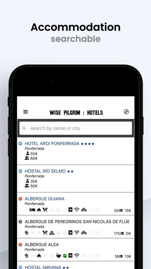 A full directory of Albergues, camping, hotels, pensions, paradors, and cases rurales.