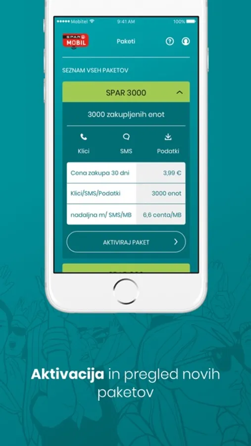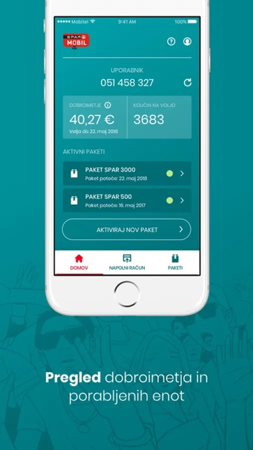 • znotraj aplikacije si lahko vključite vse pakete, ki jih ponuja predplačniška telefonija SPAR MOBIL,