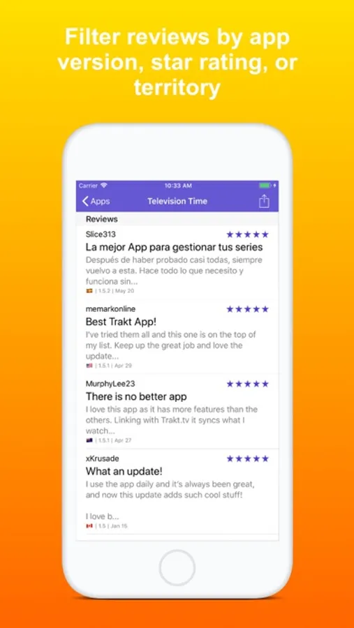 Filter reviews by territory, version, or star rating.