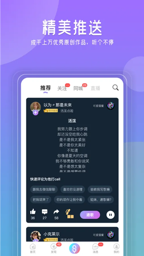 好玩、有趣的写歌体验,让小白也能快速原创一首音乐作品来表达自己,并通过分享交流认识更多喜欢音乐的95后、00后的年轻朋友。同时也是全国大学生最为喜爱的原创音乐平台之一