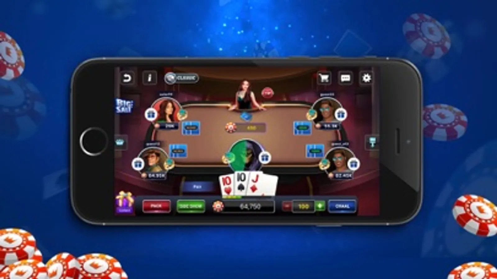 In Teen Patti app, 3 Patti, players take turns betting chips on who has the best 3 card hand. Each player has option to bet without looking at their cards (BLIND) or bet after looking (CHAAL).