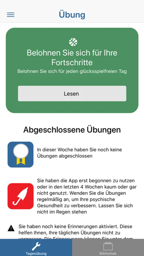 Sich um die eigene Befindlichkeit zu kümmern ist ein bisschen wie Zähneputzen: man sollte es täglich tun, sonst bringt es wenig. Die App versucht Sie daher dabei zu unterstützen, die Selbsthilfe-Übungen möglichst regelmäßig durchzuführen, damit sie in Fleisch und Blut übergehen und die Befindlichkeit ändern. Das Lesen und Verstehen vermittelt bestenfalls Aha-Effekte, führt aber meistens nicht zu nachhaltigen Veränderungen. Sie können am besten von der App profitieren, wenn Sie aktiv damit arbeiten und kontinuierlich üben! Es kann vorkommen, dass sich die Übungen manchmal wiederholen, selbst wenn Sie viele eigene ergänzen. Das ist so gewollt, denn nur durch regelmäßige Wiederholung gelingt es, Schwierigkeiten dauerhaft zu überwinden. Eine ausführliche Anleitung finden Sie hier: https://clinical-neuropsychology.de/app_de