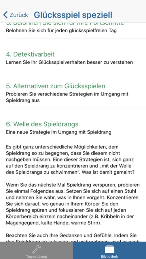 Die in der App verwendeten Selbsthilfe-Übungen basieren auf wissenschaftlich anerkannten Techniken der kognitiven Verhaltenstherapie (KVT) zur Reduktion emotionaler Probleme wie Niedergeschlagenheit und Einsamkeit, aber auch zur Verbesserung von Störungen der Impulskontrolle, die häufig Spielprobleme hervorrufen und/oder aufrechterhalten. Jeden Tag erhalten Sie eine neue Übung. Die Übungen nehmen wenige Minuten in Anspruch und können leicht in den Alltag integriert werden. Eine Push-Nachricht erinnert Sie regelmäßig (optionale Funktion). Sie haben außerdem die Möglichkeit, eigene Übungen oder Leitsätze zu ergänzen oder bestehende Übungen abzuwandeln. Sie können die App also zu Ihrem persönlichen "Schutzengel" ausbauen. Die App passt sich jedoch nicht automatisch dem Nutzungsverhalten an (es wird auf einen Lernalgorithmus verzichtet).