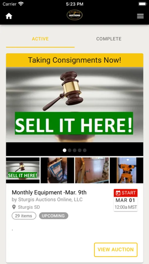Welcome to the Sturgis Auctions Online mobile bidding app! This dynamic app allows you to (1) stay informed about our upcoming auctions; (2) watch items that interest you; (3) get notifications when you’ve been outbid; (4) bid no matter where you are located (or set and forget your maximum bid to let our platform automatically bid the lowest possible winning bid for you). This is the go-to-source for up-to-the-minute information on all of our auctions.