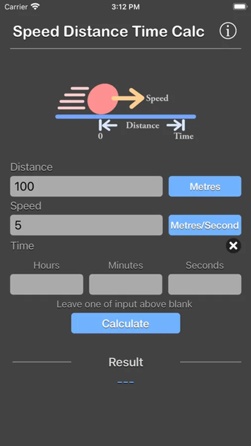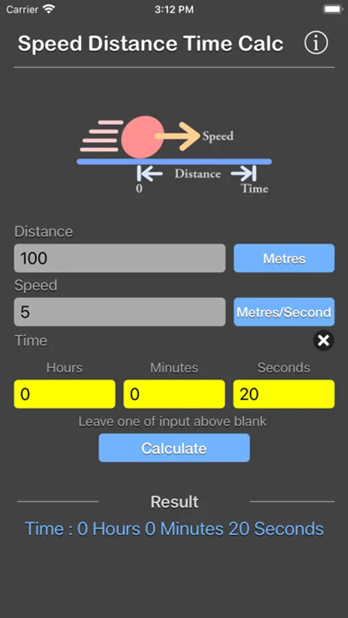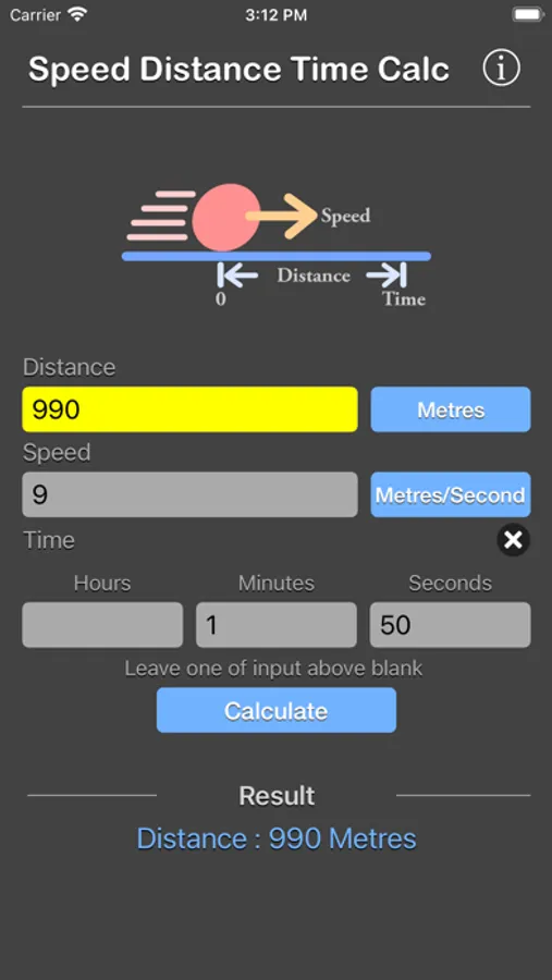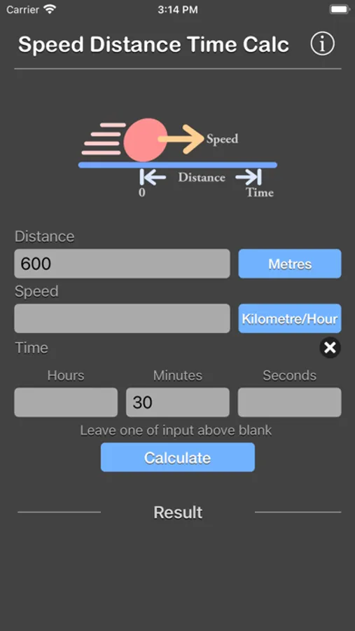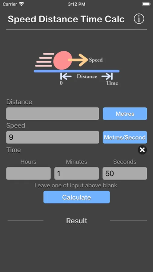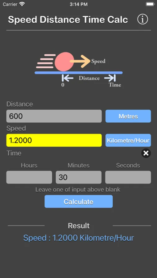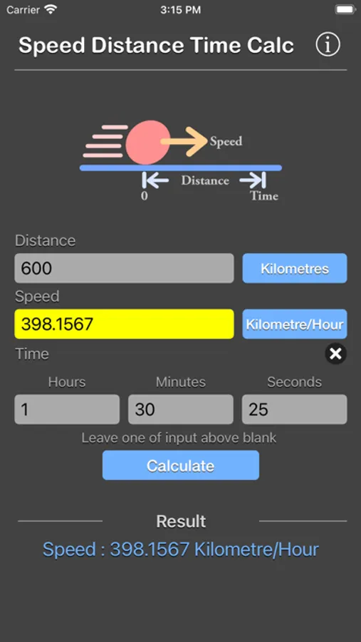 To calculate the time, both distance and speed parameters must be entered while the time input leave blank.