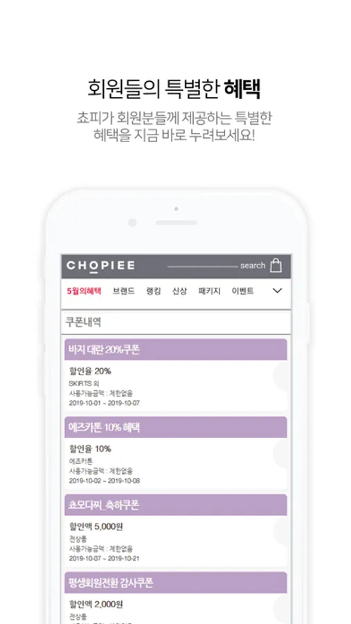 신상5% , 생일축하쿠폰 10% , 평생회원전환시 2,000원 , 앱 다운로드시 1,000원 그리고 무료배송까지!