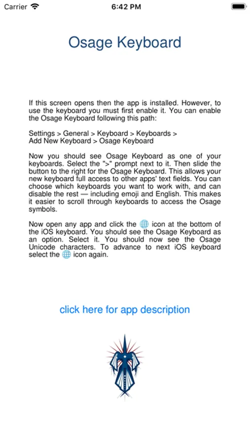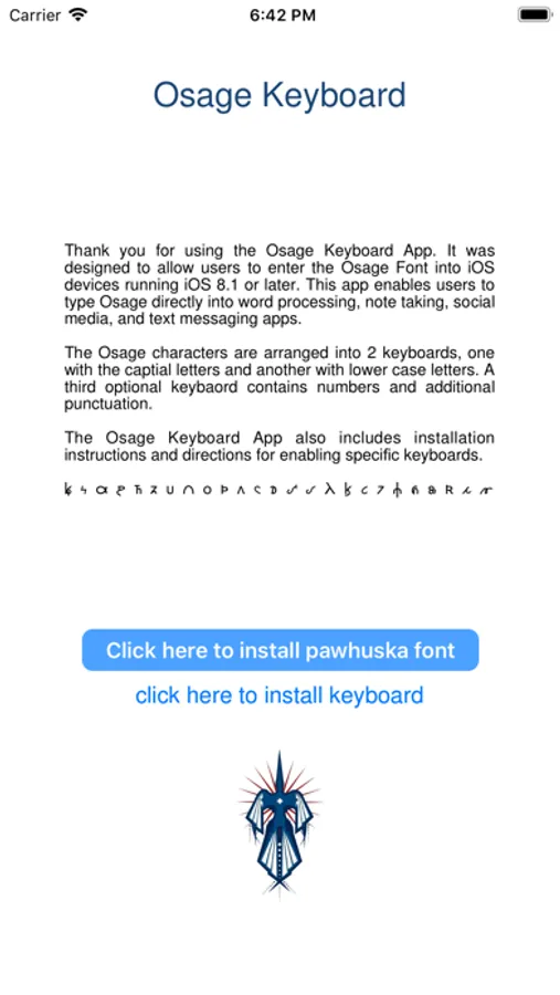 The Osage Keyboard App adds the functionality of the Pawhuska font to your iOS device. This allows you to type, text, post and update in the Osage language. Until now it has been difficult for Indigenous Language speakers to utilize their language on iPods, iPhones and iPads. With this App Osage speakers can enter Pawhuska characters into any iOS 8 textfield.