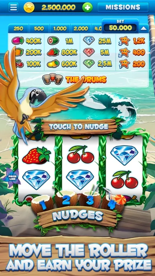 The agapornis will randomly jump toward the rollers and will help you achieve winning combinations. Get the figure of the agapornis on the rollers and you’ll have consecutive turns where you’ll be able to access new combinations with an award on the top screen.