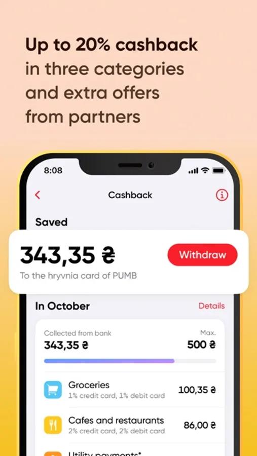 The maximum amount of the cashback reward is 500 UAH. Taxes and fees are withheld - 19.5%. Cashback refers to the accrual of cashback as part of the «Тепер Ваш мобільний кешбек із ПУМБ» Promo, provided that the appropriate category is selected in the FUIB Online mobile application. The offer is valid from September 01.09.2023 to October 31.10.2023. Details at pumb.ua