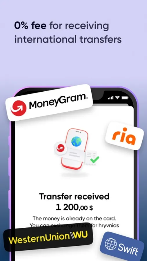 - 0% for receiving international transfers by WesternUnion, PrivatMoney, Ria, MoneyGram
